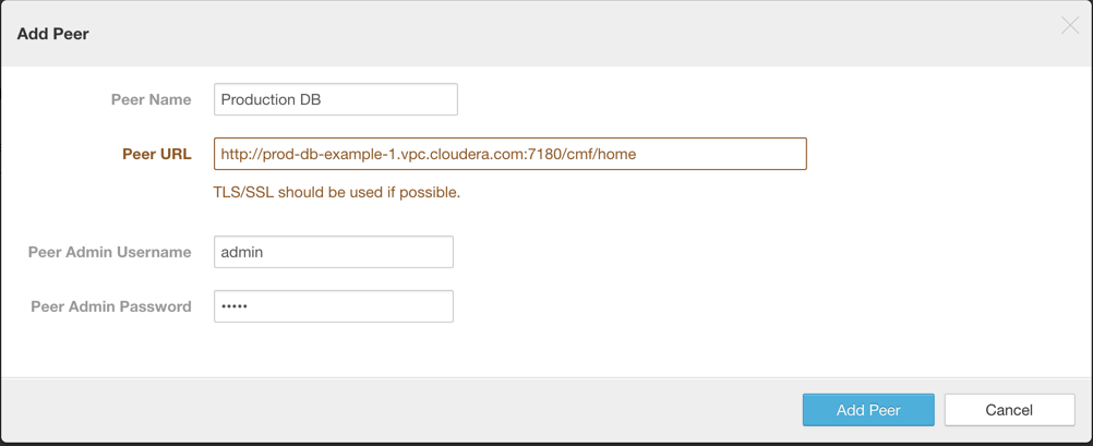 2. Peer URL - Enter the URL (including port number) for the Cloudera Manager Admin Console running on the master node of the cluster.