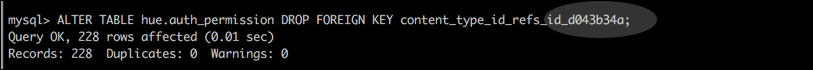 SHOW CREATE table hue.auth_permission; ALTER TABLE hue.auth_permission DROP FOREIGN KEY content_type_id_refs_id_<id value>;